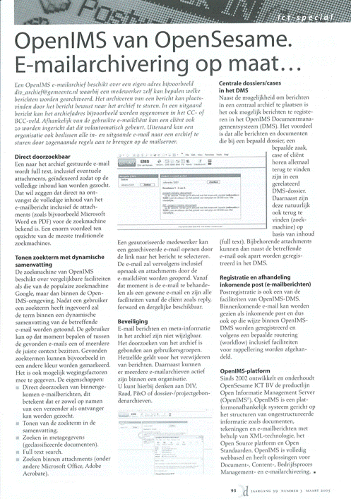 OpenIMS - EMS in een toonaangevend vakblad. Nieuwegein, maart 2005. In nummer 3 van het vakblad Documentaire Informatievoorziening en Administratieve Organisiatie (SOD) is onderstaande artikel over OpenIMS E-mail archivering opgenomen.